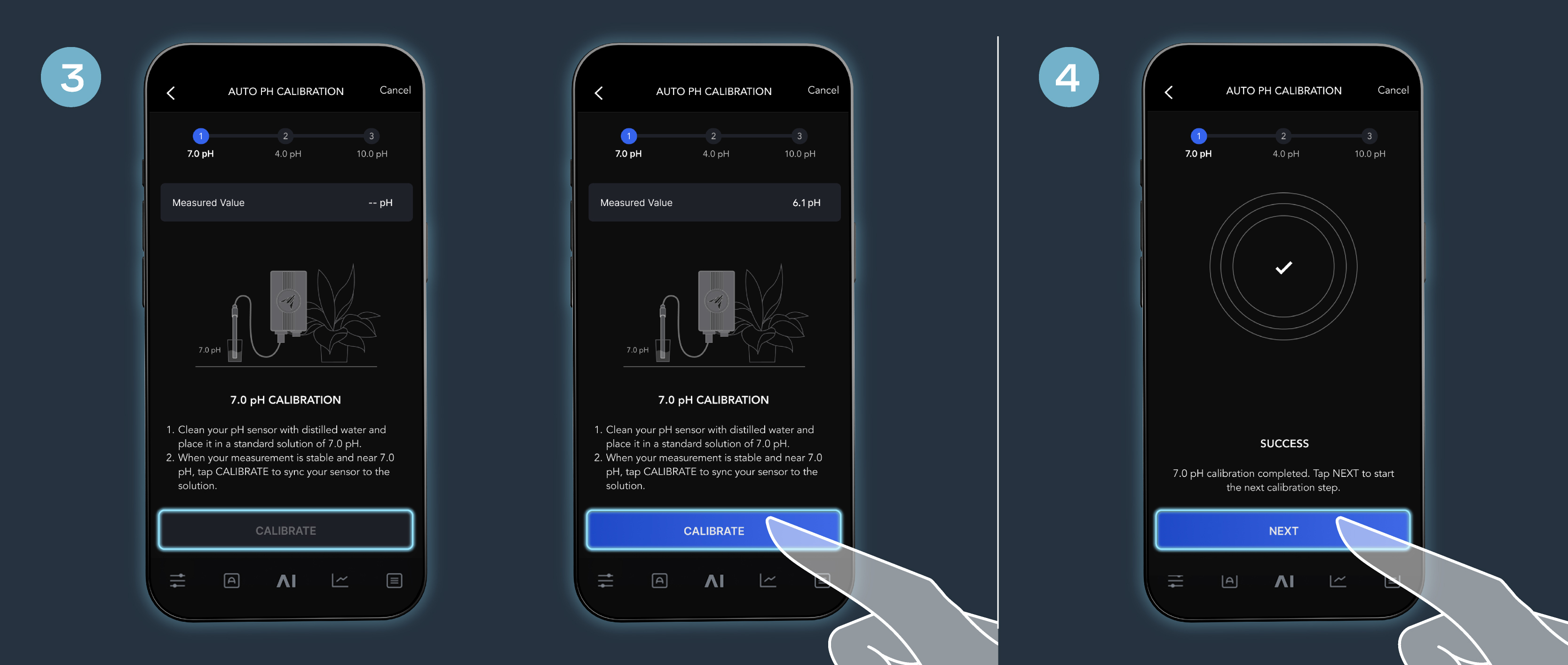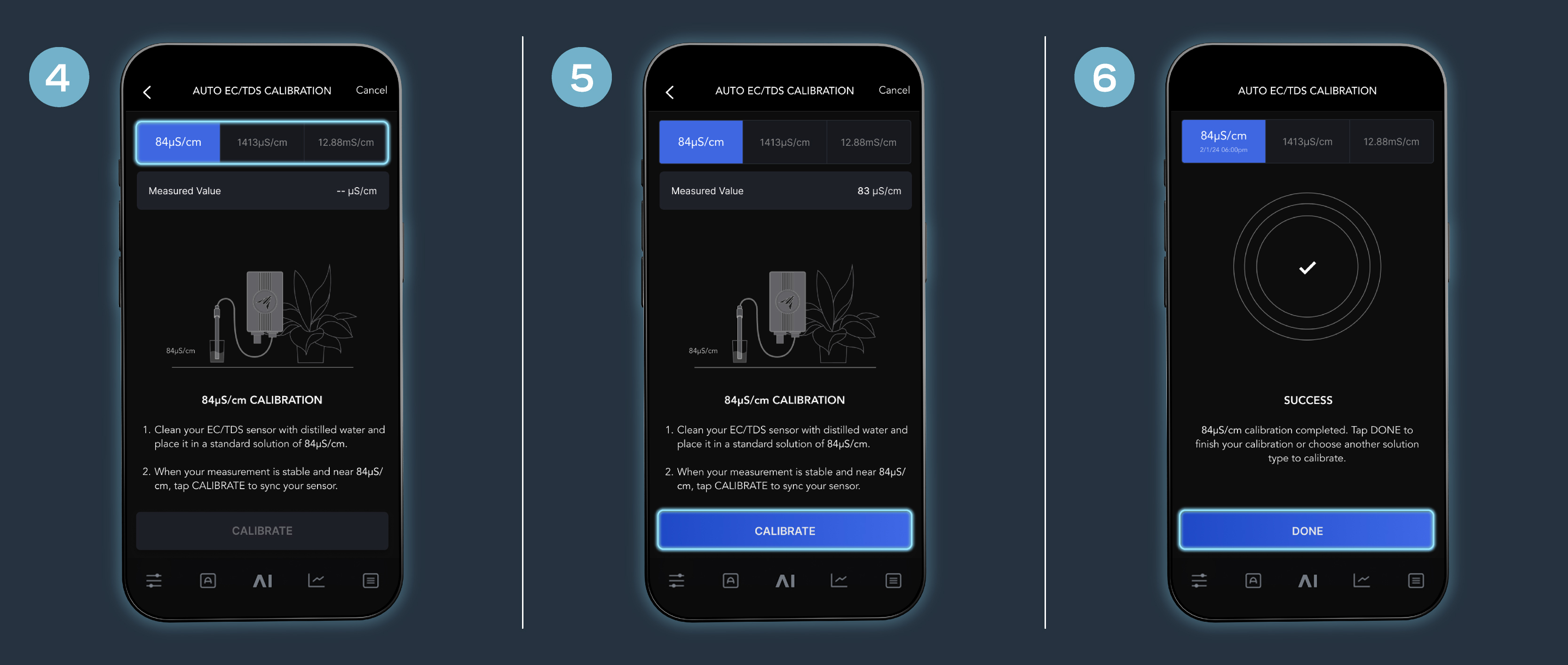 When your measurement stabilizes, the “CALIBRATE” button will illuminate on your screen. Tap “CALIBRATE’ to sync your sensor to the solution.